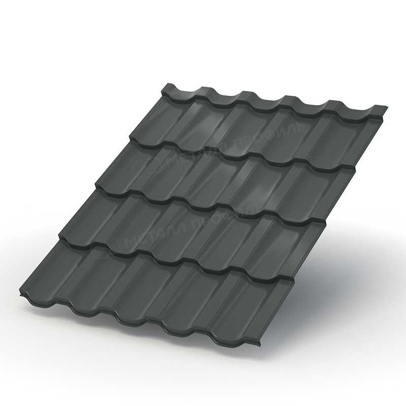 Форма волны имитирует натуральную черепицу, но с современными улучшениями для лучшей гидроизоляции. Высота ступеньки 25 мм и шаг волны 350 мм обеспечивают оптимальный баланс между эстетикой и функциональностью. Профиль адаптирован для монтажа на крышах с уклоном от 12 градусов, что делает его универсальным для различных архитектурных стилей. Темно-серый цвет подчеркивает строгий, минималистичный дизайн, гармонично вписываясь в урбанистические или загородные ландшафты.
